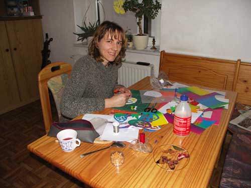 | Hallo, hier seht ihr mich gerade bei einer meiner Lieblingsbeschäftigungen, dem Basteln. Während die anderen meiner Familie am Computer ihre Kreativität unter Beweis stellen, benutze ich meine Hände um etwas herzustellen, z.B. aus Papier. Außerdem koche und backe ich sehr gern. Meine Familie bekommt immer mal neue Gerichte vorgesetzt. Im Moment bin ich gerade dabei, verschiedene Brotrezepte auszuprobieren Da ich im Moment keiner Arbeit nachgehe, nutze ich meine freie Zeit für verschiedene ehrenamtliche Aufgaben in unserer Kirchgemeinde. Das ist die ev. Moritzkirche in Zwickau. So bin ich z.B. in der Kinderarbeit und im Kirchenvorstand aktiv. Bei unseren Gemeindefesten bin ich natürlich, wie nicht anders zu erwarten, für`s Basteln zuständig. Nicht zu vergessen unser Mutti-Kind-Kreis Jetzt im Frühjahr werde ich meinen Eltern im Garten helfen, die das nicht mehr alleine schaffen können. Die Arbeit im Freien hatte ich schon vermisst.